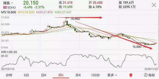 回头看了一眼搜狐股票,感觉还不如不看。2017年十月份,搜狐的股价来到了70.86美金一线附近,仅仅经历了一年多一点的时间,搜狐股价直接暴跌,来到了现在的20.15附近,跌幅高达71.5%,从一个投资者的角度来看,真惨啊!